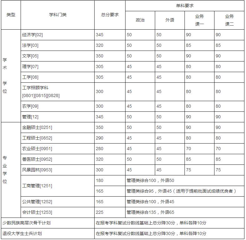 說明:1、上表為我校基本復(fù)試分?jǐn)?shù)要求,生源充裕學(xué)院可根據(jù)整體考試情況、招生計(jì)劃、學(xué)科專業(yè)特點(diǎn)等,上調(diào)分?jǐn)?shù)要求,但差額復(fù)試比例不得低于120%。報(bào)考該類學(xué)院的考生須達(dá)到學(xué)院公布的復(fù)試分?jǐn)?shù)要求才能參加復(fù)試。學(xué)院調(diào)整后的復(fù)試分?jǐn)?shù)線、復(fù)試辦法,由各院近日公布,請(qǐng)考生密切留意。