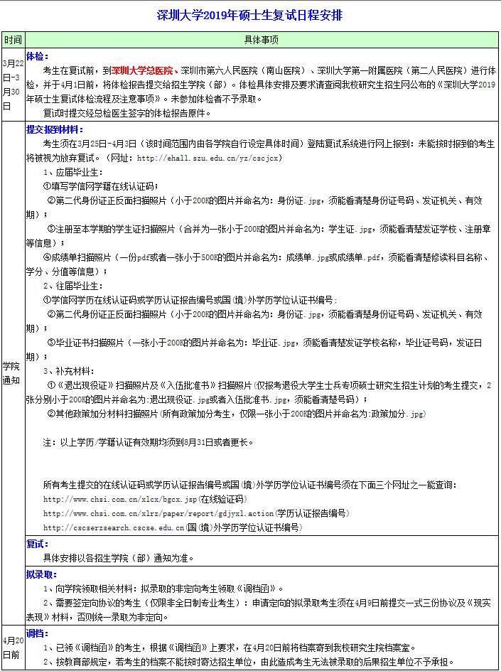復試資格審查及日程安排詳見《深圳大學2019年碩士生復試日程安排》。
