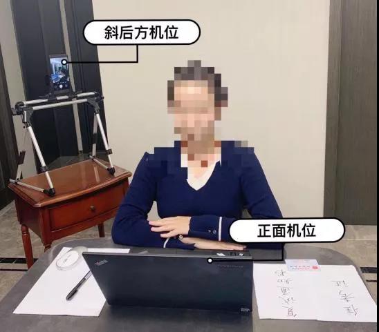 考生要雙機位模式參加復試,即需要注冊申請兩個獨立賬號同時進入候考室或復試室,分別登陸兩部帶攝像頭的設(shè)備,手機或電腦均可。一臺設(shè)備從正面拍攝,另一臺設(shè)備從考生側(cè)后方拍攝??忌藘膳_設(shè)備開啟攝像頭,一臺設(shè)備將攝像頭對準考生本人,另一臺設(shè)備攝像頭從考生后方成45°拍攝(后方拍攝的設(shè)備須靜麥和關(guān)閉音頻,防止回音影響復試),并保證考生端考試屏幕能清晰地被復試專家組看到。