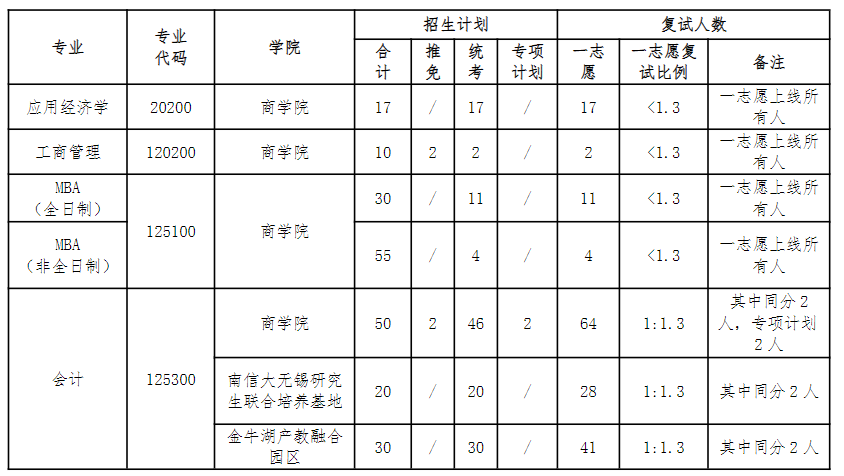 根據(jù)教育部關(guān)于研究生錄取工作中要堅(jiān)持“按需招生、德智體全面衡量、擇優(yōu)錄取、寧缺毋濫”的原則及相關(guān)規(guī)定,為保證我院碩士研究生招生工作的順利進(jìn)行,提高招生工作效率和保證生源質(zhì)量,既維護(hù)考生權(quán)益,又保證公平、公正、公開,根據(jù)南京信息工程大學(xué)2022年招收攻讀碩士學(xué)位研究生復(fù)試及錄取工作相關(guān)文件,結(jié)合我院實(shí)際情況,經(jīng)我院研究生復(fù)試工作領(lǐng)導(dǎo)小組討論,特制定020200應(yīng)用經(jīng)濟(jì)學(xué)、120200工商管理、125100工商管理碩士(MBA)、125300會(huì)計(jì)專碩四個(gè)碩士專業(yè)復(fù)試及錄取工作細(xì)則。一、招生指標(biāo)、復(fù)試比例及復(fù)試名單確定根據(jù)研究生院相關(guān)文件,實(shí)行差額復(fù)試,復(fù)試名單以研究生院公布的名單為準(zhǔn)。各專業(yè)招生計(jì)劃及復(fù)試名額如下: