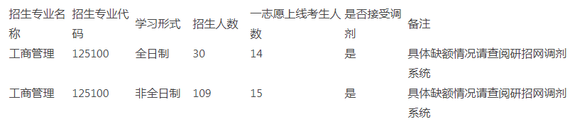 (1)第一志愿報考專業(yè)為工商管理碩士(MBA),且初試成績符合MBA專業(yè)國家B類線成績可以申請調(diào)劑。不接收第一志愿報考專業(yè)為公共管理碩士(MPA)、旅游管理碩士(MTA)、工程管理碩士(MEM)、會計專業(yè)碩士(MPAcc)、圖書情報專業(yè)碩士(MLIS)、審計專業(yè)碩士(Maud)的考生;