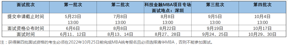 ②填寫和上傳申請材料。網(wǎng)上提交的申請材料包括:申請書、成績單、個人簡歷、收入證明、單位組織結(jié)構(gòu)圖,推薦信(0-3封)。申請材料的具體內(nèi)容和要求見系統(tǒng)內(nèi)說明??忌峤簧暾埐牧蠒r需要選擇申請面試批次,并在所選批次申請材料提交截止日期前提交。其中科技金融MBA項(xiàng)目專場僅面向申請清華科技金融MBA項(xiàng)目的考生,且面試地點(diǎn)在深圳。各批次的申請截止時間、面試資格公布時間和面試時間見下方"面試批次"表。