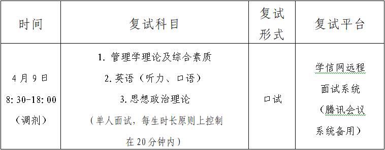 (三)復(fù)試成績以 100 分為滿分,計(jì)算方式如下:復(fù)試成績=管理學(xué)理論及綜合素質(zhì)成績×60%+英語(聽力、口語)×20%+思想政治理論成績×20%。